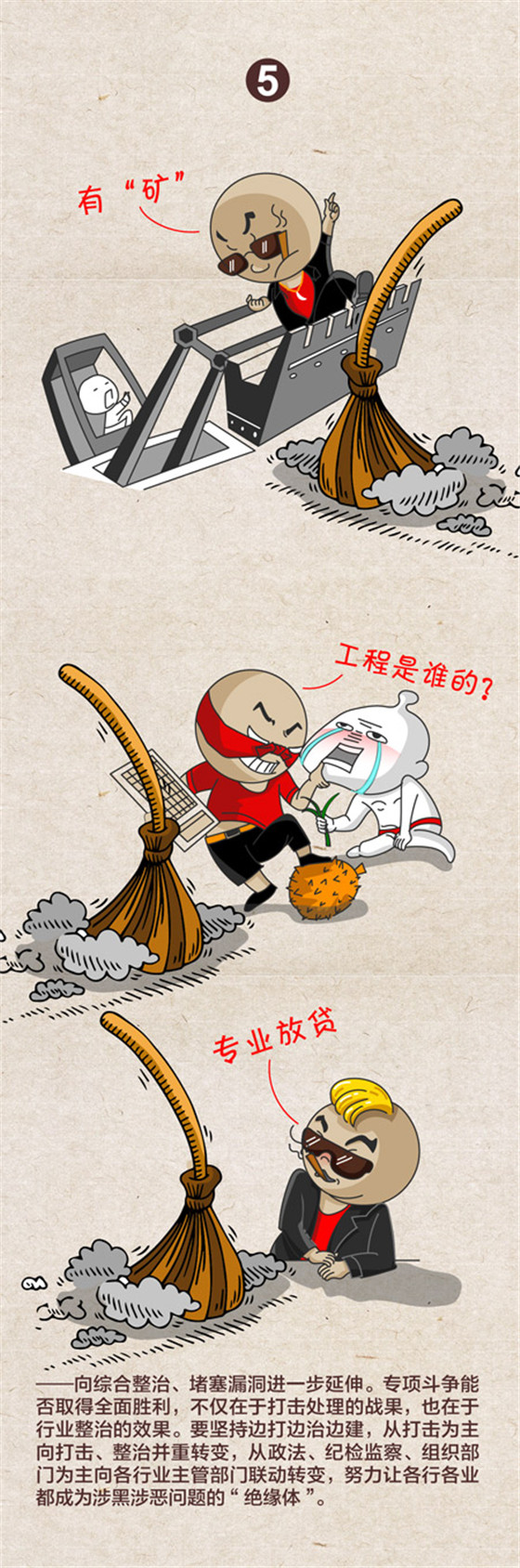 中央紀(jì)委國家監(jiān)委網(wǎng)站近日發(fā)布一組題為《2019掃黑除惡“六個延伸”》的漫畫,對2019年掃黑除惡專項斗爭提出向偵破大案、打財斷血進一步延伸,向網(wǎng)絡(luò)空間、新興領(lǐng)域進一步延伸,向深挖幕后、打傘破網(wǎng)進一步延伸,向依法懲治、快訴快判進一步延伸,向綜合整治、堵塞漏洞進一步延伸,向固本強基、鏟除土壤進一步延伸等六大方向。