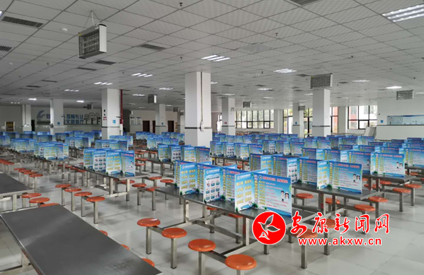 學校在食堂復工前,對食堂工作人員實施了嚴格的健康篩查。工作中嚴格按照每日監(jiān)測消毒措施,做好個人健康監(jiān)測。食堂內環(huán)境衛(wèi)生及餐具消毒,做到謹慎細致。師生就餐前,統(tǒng)一按要求洗手,取餐窗口一路列隊,且前后左右間距1米。就餐時每桌采用擋板進行隔斷,避免面對面交叉。取餐就餐均分級分班錯峰錯時進行,避免人員聚集。