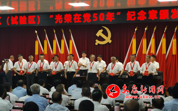 在慶“七一”表彰大會上,全體參會黨員面對鮮紅的黨旗,高舉右手,重溫入黨誓詞,鏗鏘嘹亮的宣誓聲響徹會場,激蕩人心,昭示著全區(qū)黨員矢志不渝為黨和人民事業(yè)不懈奮斗的堅定信念。會上,為高劍村黨支部等10個先進基層黨組織、王開昌等10名優(yōu)秀黨務工作者、王天蒼等20名優(yōu)秀共產黨員代表分別頒發(fā)了榮譽證書,為“光榮在黨五十年”的10名老黨員代表頒發(fā)了紀念章。