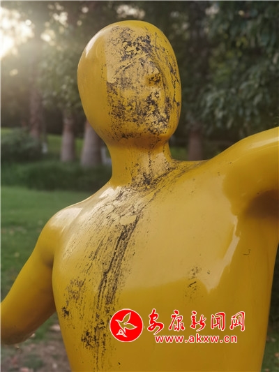 五一期間,安康高新區(qū)運(yùn)動公園內(nèi),一處運(yùn)動塑像遭人“抹黑”,污跡斑斑,有礙觀瞻。(記者 許安)?
