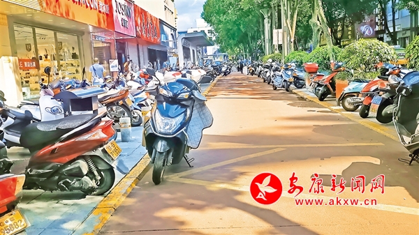 6月23日,金州南路東側(cè),摩托車、電動車停放在公交港灣,存在安全隱患。(記者 吳單 攝)