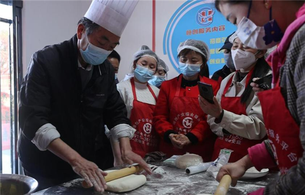 △學員們跟著師傅認真學習面點技能