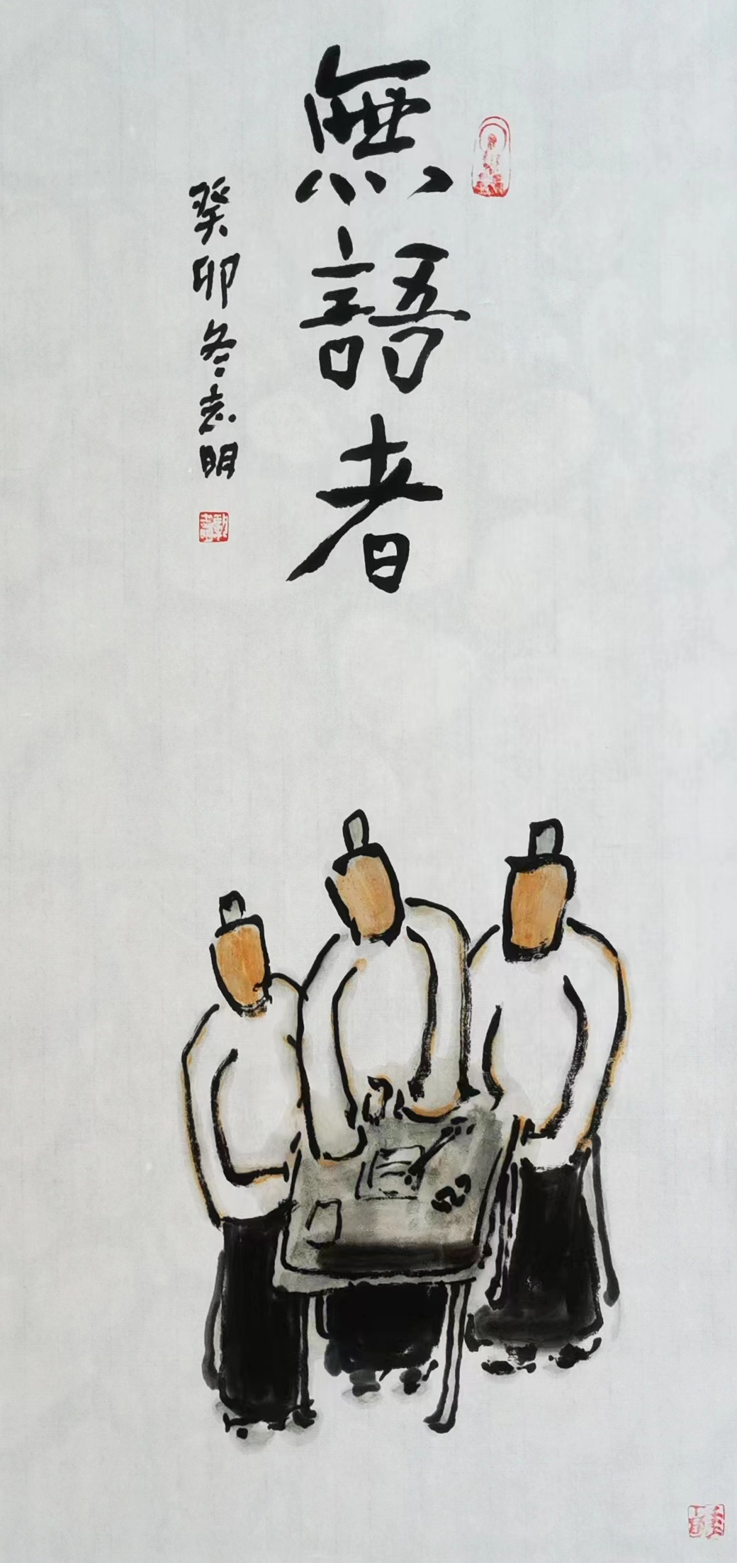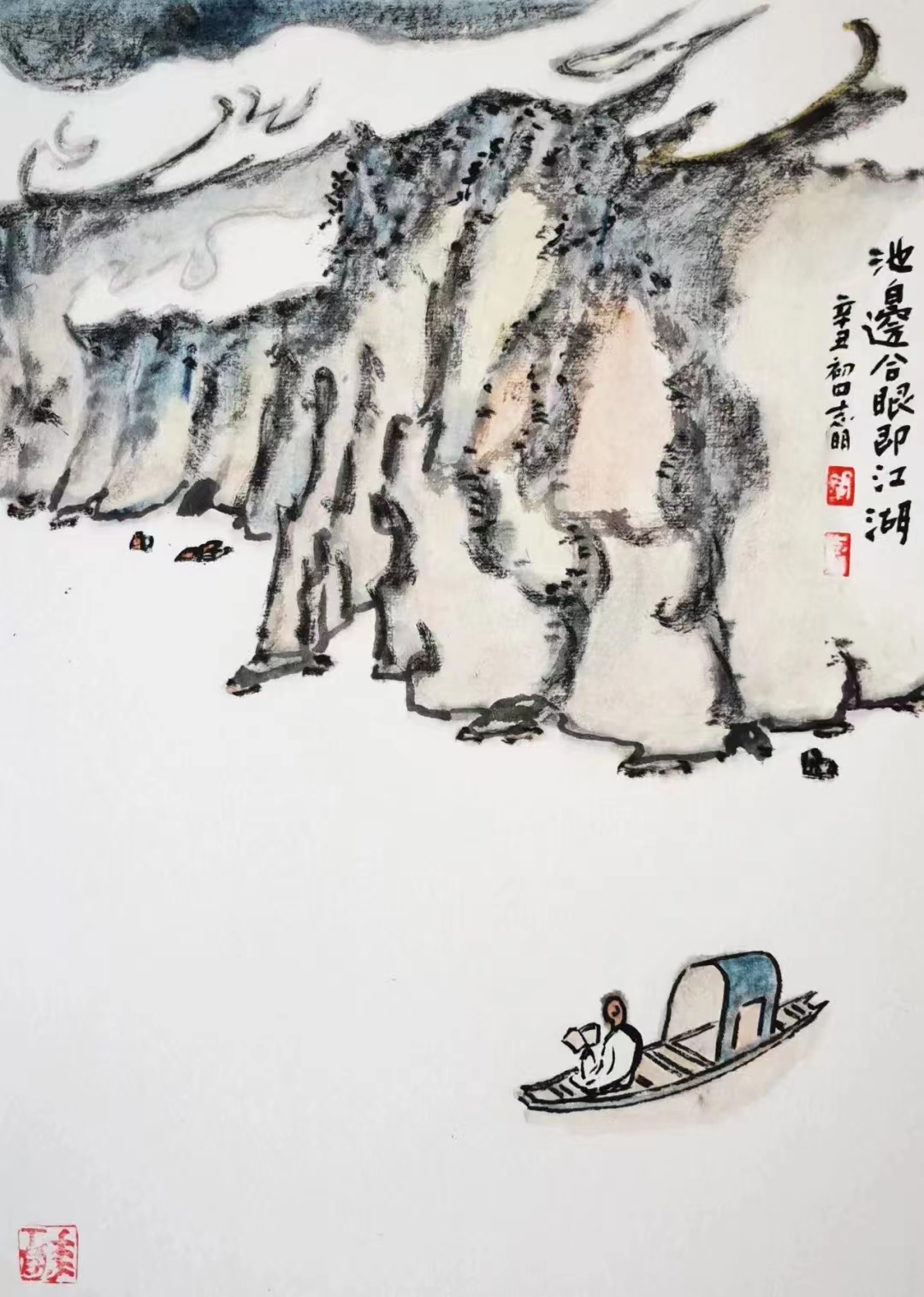 記得那一年的端午節(jié),鞏志明發(fā)來短信,是他寫的一首詩:綠粽黃酒聚江邊,白帆紅燭祭屈原。三千清淚流不得,九萬渾念飄上天。誰有郁悶誰散淡,何謂圓滑何忠奸。十丈風(fēng)塵古今在,談笑真?zhèn)位聼煛?017年,我遷新居,鞏老師為我寄來小品畫《福到眼前》,我很喜歡,并懸掛至新居玄關(guān)。這些年,鞏志明老師常做影展畫展策劃及影評講座,自已也臨池不輟,水墨丹青,寄情抒懷,他的文人小品有思想性、有創(chuàng)造性。雖畫的是松風(fēng)明月,小舟流水或遠(yuǎn)古人物,但都寄托了他當(dāng)下的心境,以消塊壘。誠如有人評論他為“吾師真文人,畫亦真性情!”他不僅只是身居畫室的怡情文人,他亦是心憂天下的豪俠。面對世間不平事,他也是激揚(yáng)文字,揮斥方遒!在功利的當(dāng)下,鞏志明尤其顯得難能可貴!?