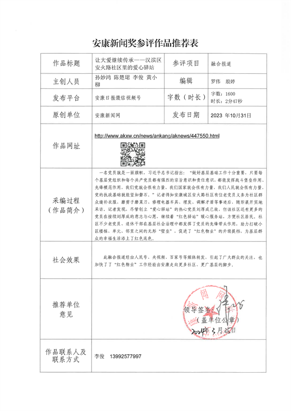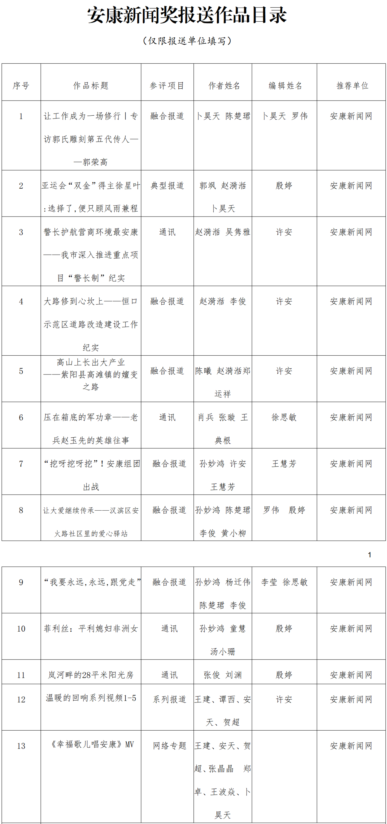 經(jīng)過(guò)編委會(huì)推薦、社黨委研究決定,擬推薦以下13件新聞作品參評(píng)2023年度“安康新聞獎(jiǎng)”。公示時(shí)間從2024年3月25日至2024年3月29日,公示期為5個(gè)工作日。如有不同意見,請(qǐng)向安康日?qǐng)?bào)社機(jī)關(guān)紀(jì)委、新聞管理部反映。