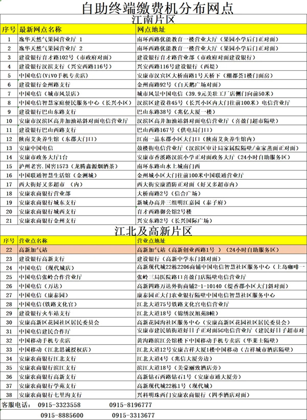 注意!安康天然氣可在以下網(wǎng)點進行自助繳費