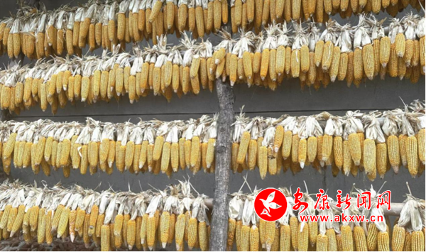 農(nóng)家小院房檐下掛滿了玉米棒