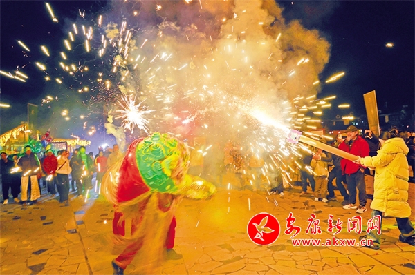 夜幕降臨,在中壩作坊小鎮(zhèn)廣場(chǎng)上,音樂(lè)響起,熊熊篝火燃燒,伴隨著動(dòng)感的音樂(lè),游客與居民們手牽手,肩并肩,圍著篝火載歌載舞。而最吸引人的還是舞火龍、火獅子表演,在璀璨煙火中,火龍飛舞盤旋,火獅子搖頭晃腦,騰挪跳躍,威風(fēng)八面,現(xiàn)場(chǎng)不少游客噴起煙花,花燒得越旺、鑼鼓聲越急,獅子舞得也越歡快,大家共同享受著這場(chǎng)精彩紛呈的非遺文化盛宴。