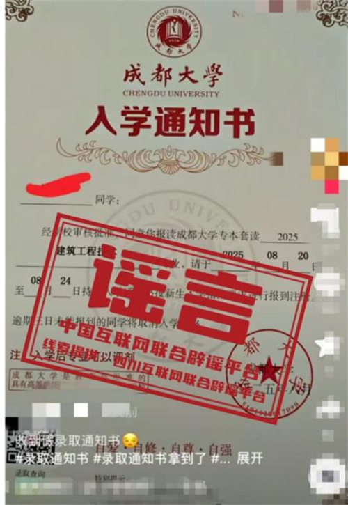 教育部多次提醒,部分機(jī)構(gòu)和個人打著普通高等學(xué)歷教育幌子,實際卻為自考助學(xué)、網(wǎng)絡(luò)教育等其他教育形式,或進(jìn)行虛假宣傳。如未通過高考招生錄取獲得正式通知書,無法注冊普通高校正式學(xué)籍,也無法取得普通高等學(xué)校學(xué)歷證書。考生及家長應(yīng)通過正規(guī)渠道核驗錄取信息,嚴(yán)格保護(hù)個人信息,防止被不法分子利用。(來源:四川互聯(lián)網(wǎng)舉報辟謠平臺、成都網(wǎng)絡(luò)辟謠)