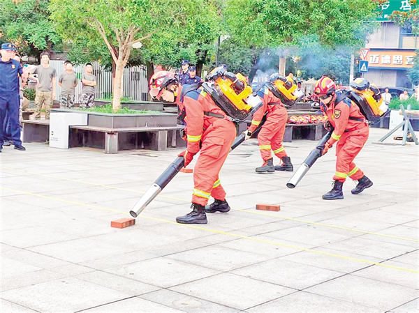 完成后,隊(duì)員迅速背負(fù)風(fēng)力滅火機(jī),將起點(diǎn)處的紅磚吹過(guò)10米終點(diǎn)處。風(fēng)力滅火機(jī)呼嘯作響,隊(duì)員們需精準(zhǔn)控制風(fēng)力方向和強(qiáng)度,這模擬的是實(shí)戰(zhàn)中清理障礙物、開辟隔離帶的場(chǎng)景。