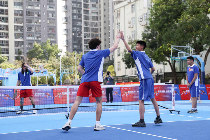 4月15日,在深圳市南山外國(guó)語學(xué)校(集團(tuán))高新中學(xué),中美學(xué)生結(jié)對(duì)進(jìn)行匹克球雙打比賽。新華社記者 梁旭 攝