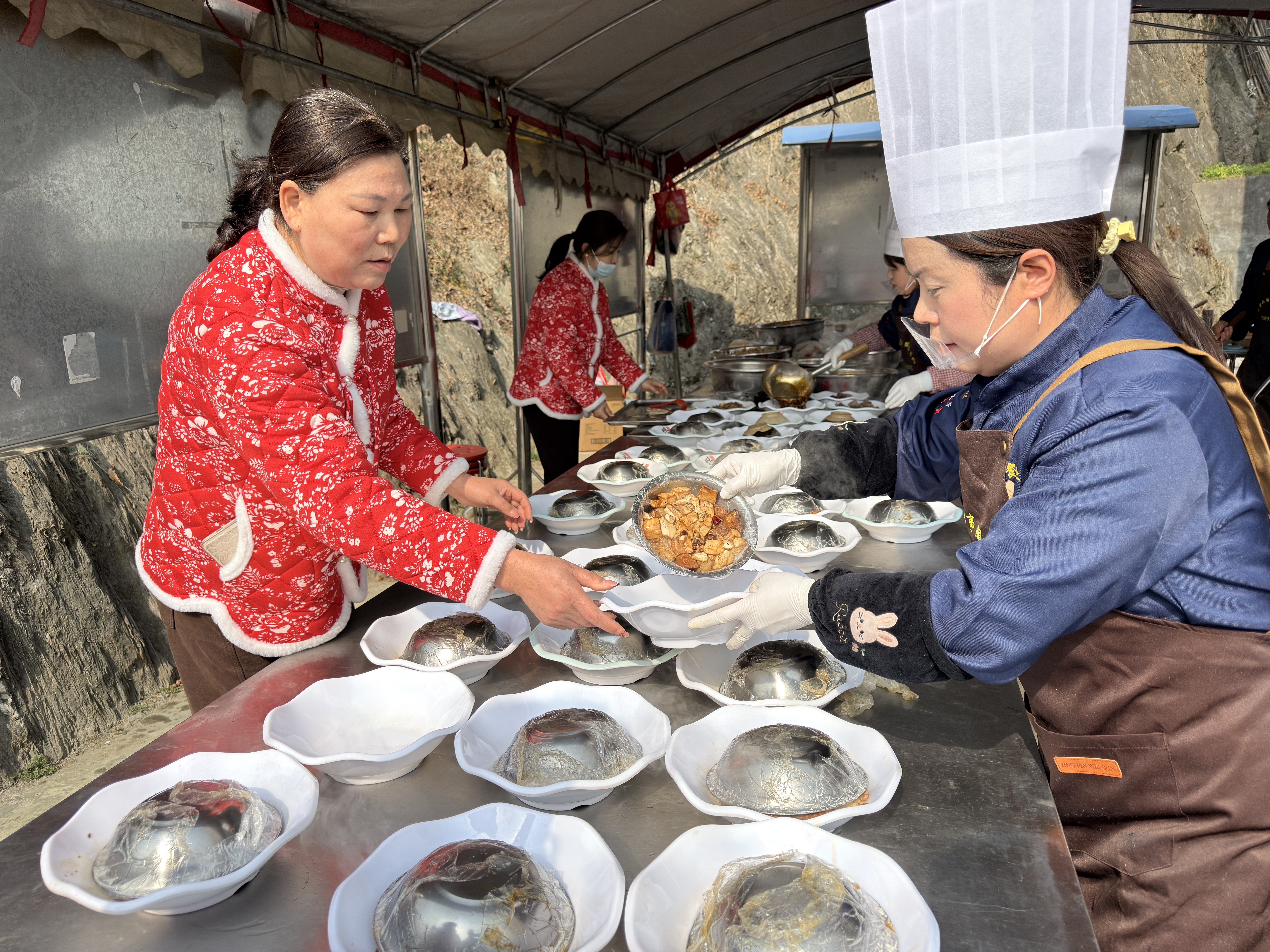 工作人員準備特色美食“蒸碗”