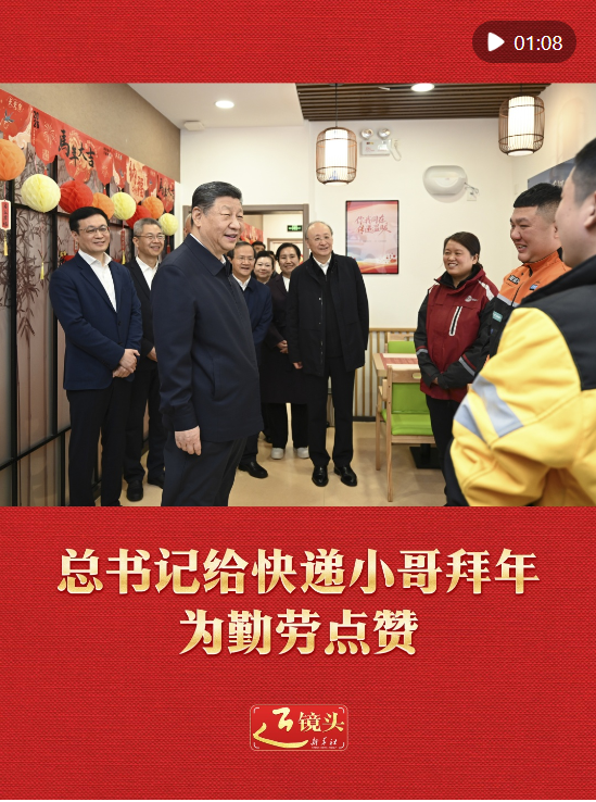 10日上午,習(xí)近平總書記在北京考察調(diào)研,走進(jìn)西城區(qū)新街口街道父母食堂,見(jiàn)到在這里休息的快遞小哥,關(guān)切詢問(wèn)他們的工作和生活,為他們付出的辛勞和作出的貢獻(xiàn)點(diǎn)贊,并給他們拜年。