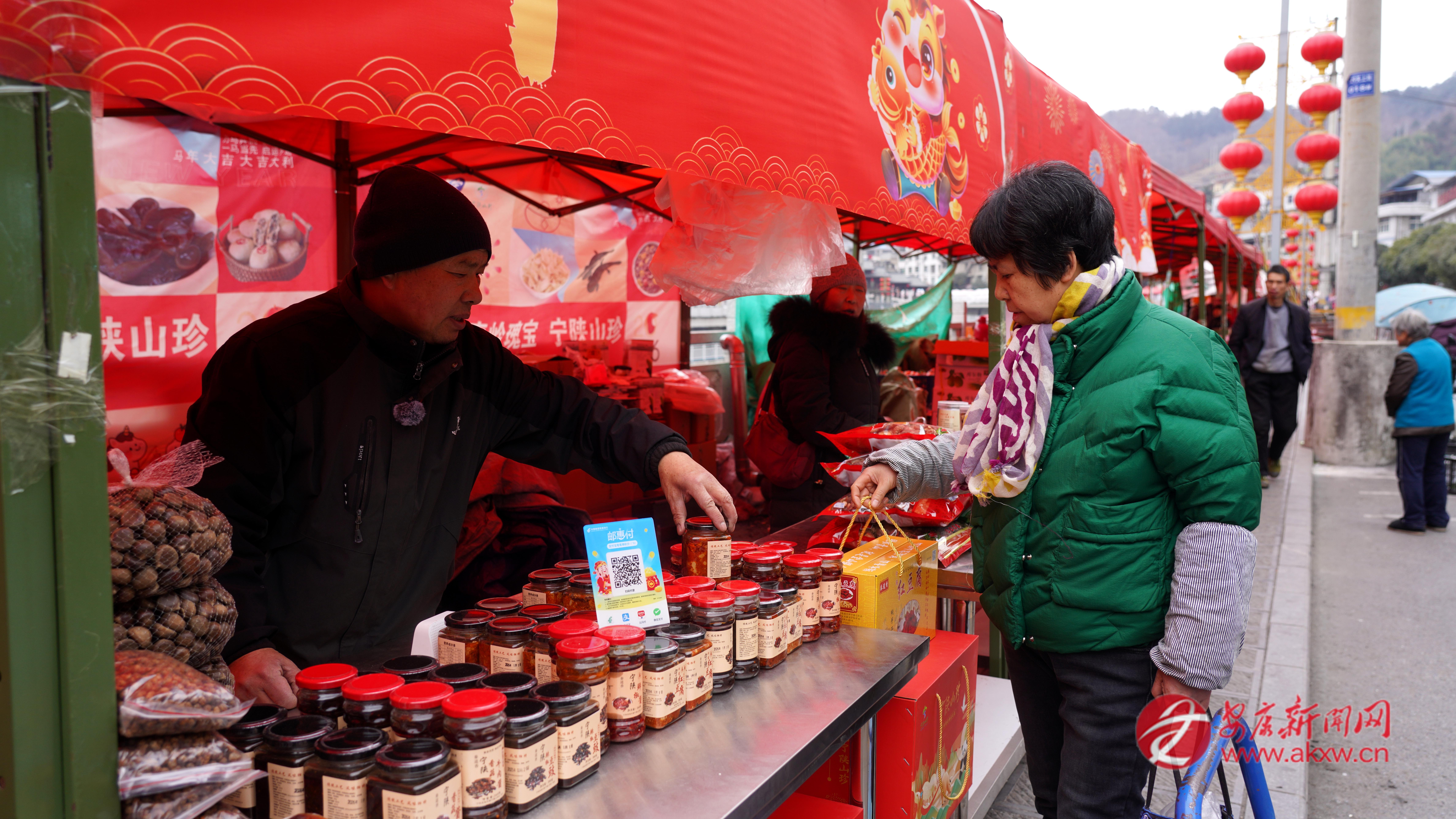 在寧陜縣城河堤東街的“年貨大集”,134個攤位整齊排布,本地臘肉油亮誘人、野生香菇厚實(shí)飽滿、土蜂蜜晶瑩剔透、木耳如墨玉般堆疊;新衣、玩具、春聯(lián)、中國結(jié)琳瑯滿目,一片喜慶祥和的景象。