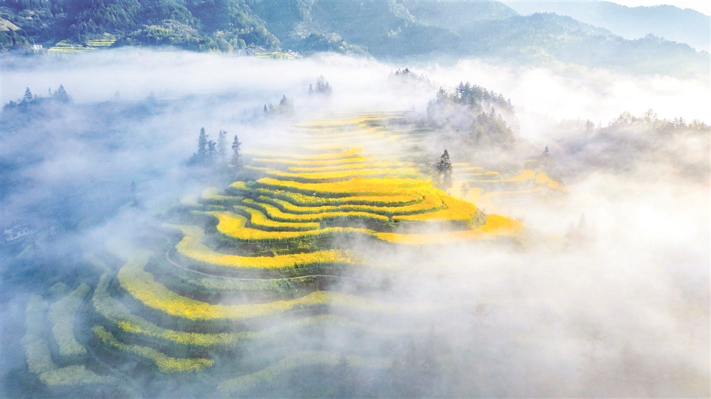 沿著蜿蜒的山路盤(pán)旋而上,轉(zhuǎn)過(guò)一個(gè)山坳,眼前豁然開(kāi)朗——那金黃的油菜花,竟從山腳一直鋪到云端。層層疊疊的梯田,依著山勢(shì)盤(pán)旋而上,每一道田埂都勾勒出柔美的曲線。油菜花便順著這些曲線,開(kāi)得浩浩蕩蕩,開(kāi)得理直氣壯。晨霧未散時(shí),花海在薄紗般的霧氣里若隱若現(xiàn),恍若仙境;待太陽(yáng)升高,霧氣褪去,那金黃便愈發(fā)耀眼,直晃得人瞇起眼睛。風(fēng)過(guò)處,花浪翻涌,從這山傳到那山,沙沙的聲響里,滿(mǎn)是春天的氣息。