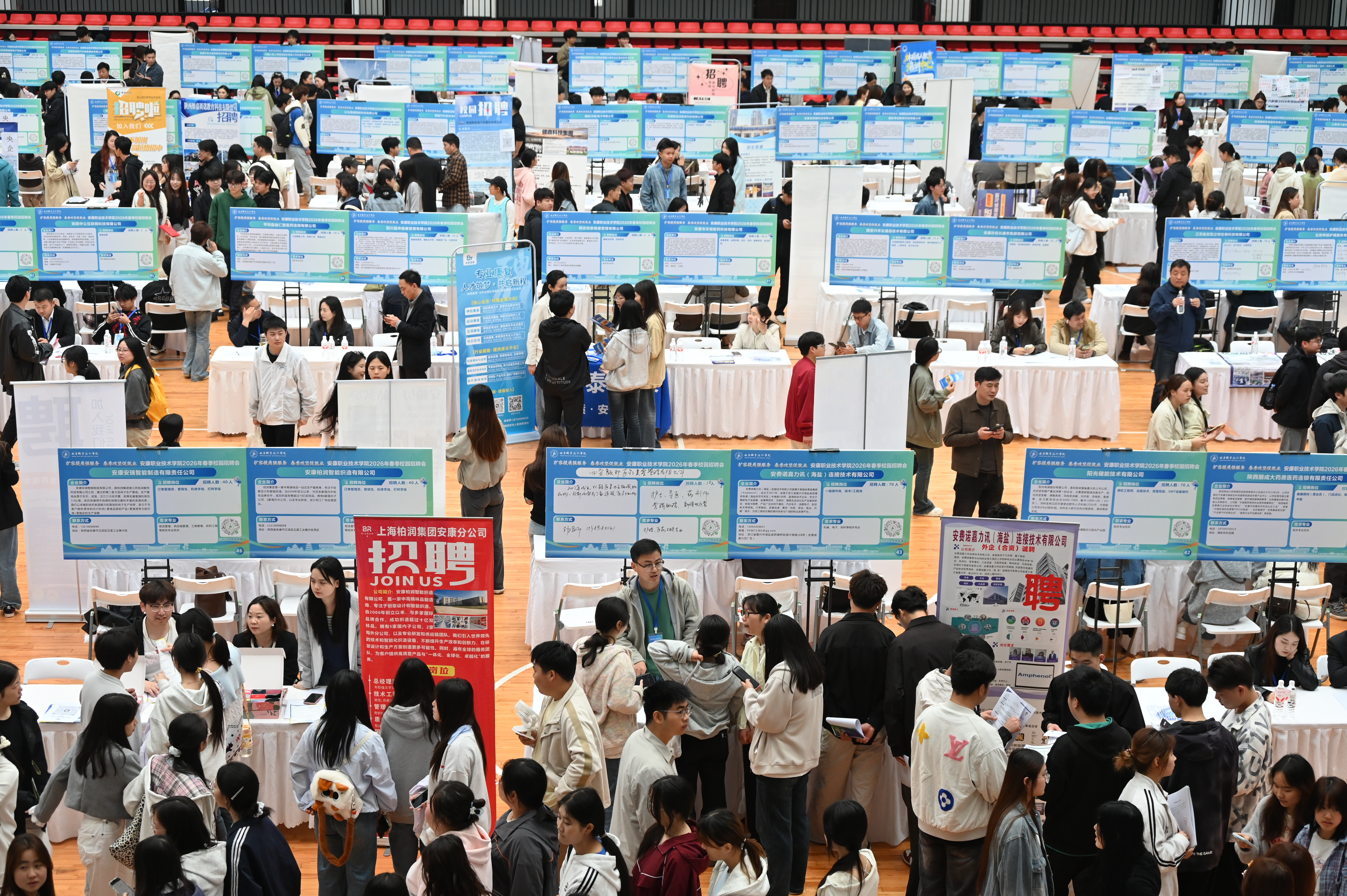 4月10日,安康職業(yè)技術(shù)學(xué)院舉辦2026年春季校園招聘會。本次招聘會由市人社局與安康職業(yè)技術(shù)學(xué)院聯(lián)合主辦,招聘會匯聚省內(nèi)外170家優(yōu)質(zhì)企業(yè),帶來各類招聘崗位6023個(gè),崗位供給充足、薪資待遇較往年大幅提升,整體招聘質(zhì)量穩(wěn)步提高,為畢業(yè)生搭建了高效的就業(yè)對接平臺。當(dāng)日現(xiàn)場入場求職人員4000余人,累計(jì)投遞簡歷4860余份。 張智明 攝