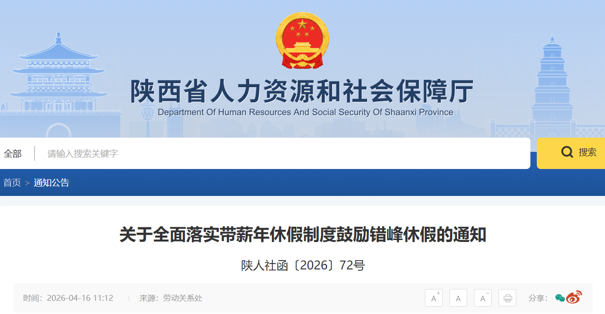 陜西發(fā)布最新通知:全面落實(shí)帶薪年休假制度+鼓勵(lì)錯(cuò)峰休假